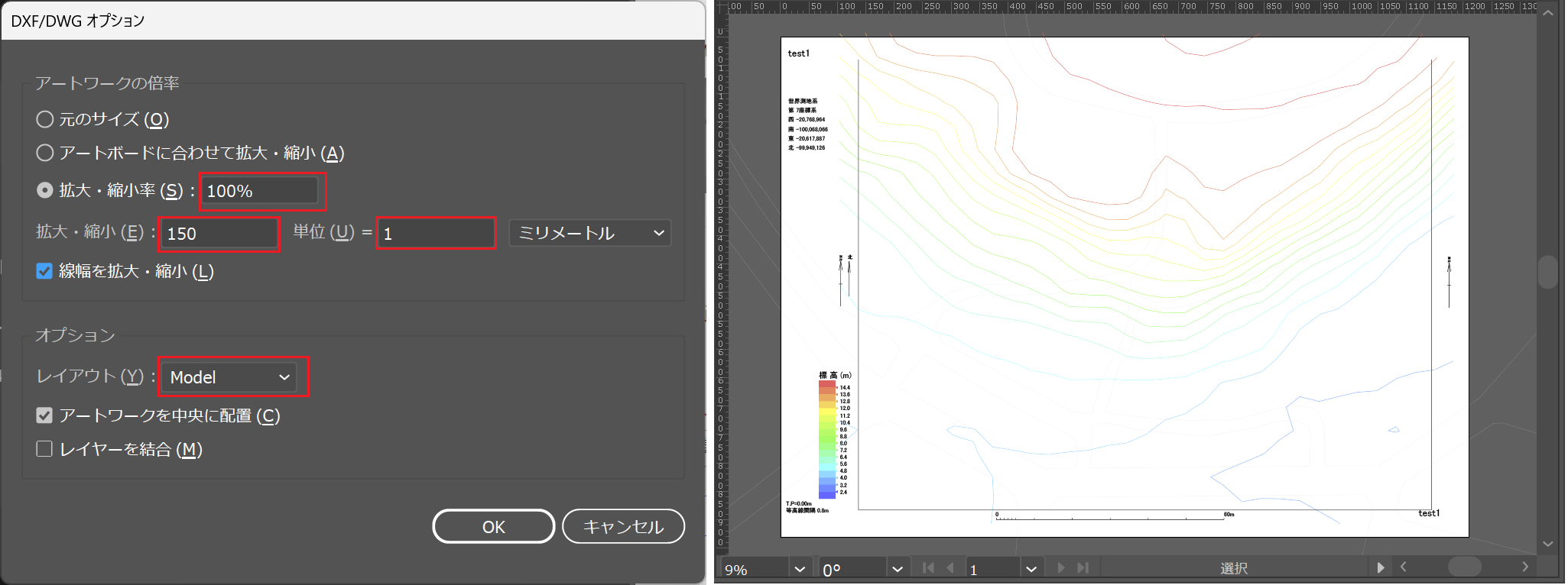 vectormapmakerで1/150の等高線の地図を取りだしました。取り出す際に用紙サイズをA0にし、イラレで1.5%の拡大・縮小を設定し開きました。しかし、アートボードをA0のサイズに設定して取り出した地図と合わせてみると取り出したデータがはるかにA0よりも大きくなっており、地図の用紙サイズをイラレで確認すると1892mm×2675mmになっていました。