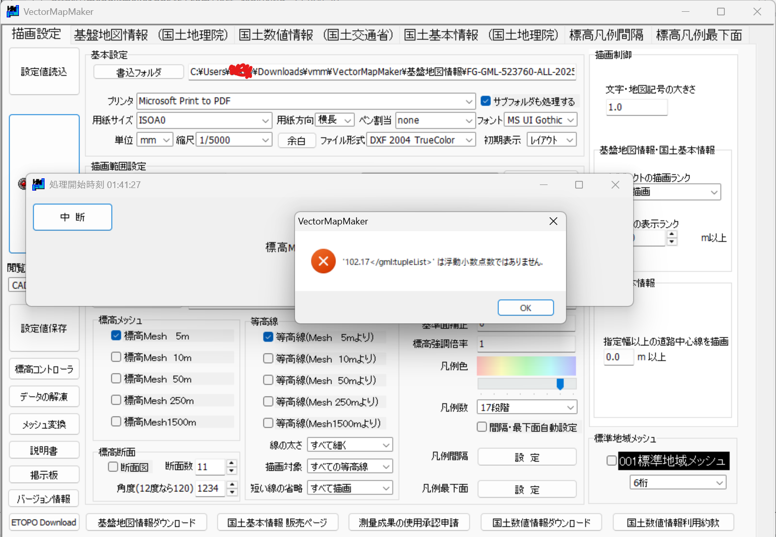 基盤地図情報だけで出力する時は出ないのですが、DEMデータを入れで出力しようとすると'24.79</gml:tupleList>'と表示され、データを変換できません。