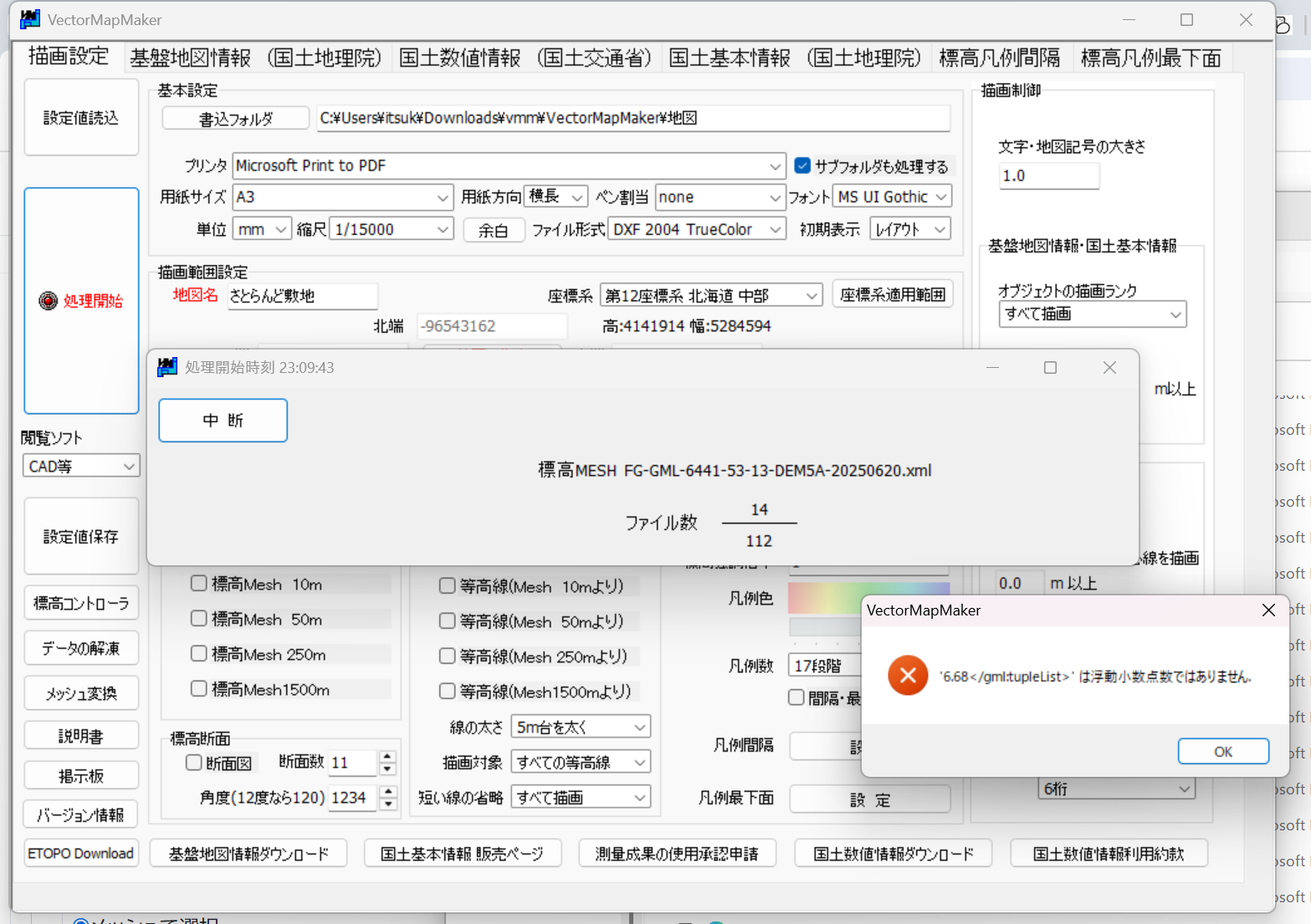 基盤地図情報ダウンロードサービスから、基本情報と数値標高モデルをダウンロードし、vmmフォルダの基盤地図情報のフォルダに入れ、解凍しようとするとボタンを押しても何も反応しません。また、パソコン内でデータを解凍すると地図範囲は指定できるようになるのですが、添付のようなエラーが出てきてしまいます。解決策を教えてほしいです。